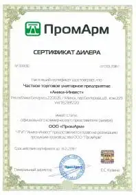 С 1 января 2018г. у ООО «ПромАрм» появился официальный представитель в Республике Беларусь – ЧТУП «Аника-Инвест», г. Минск. Подтверждаем полномочия ЧТУП «Аника-Инвест» на право реализации продукции ООО «ПромАрм», а именно: затворов поворотных дисковых и задвижек шиберных на территории Республики Беларусь. Поставляемая через ЧТУП «Аника-Инвест» продукция производства ООО «ПромАрм» обеспечивается нашими гарантийными обязательствами.