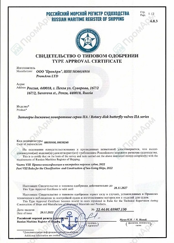 ООО «ПромАрм» обновило свидетельство о типовом одобрении Российского морского регистра судоходства на затворы поворотные дисковые производства «ПромАрм» серии ПА 200, ПА 300, ПА 400, ПА 600, ПА 700, ПА 900.